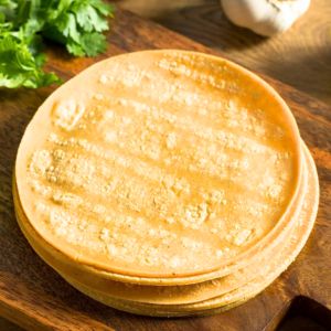 Warm corn tortillas are round and thin. They are made with unleavened coarse masa flour (ground, dried and sifted masa dough) that has been nixtamalized with lime.