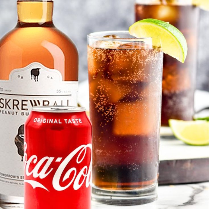 The recipe is right there in the drink’s name: Skrewball + Coke. My peanut butter whiskey & cola recipe is as simple as a two-ingredient drink gets!